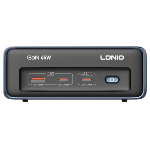 رابط برق USB دار 45 واتی الدینیو مدل LDNIO SC1 دارای 2 پورت برق یونیورسال می باشد که تمامی وسایل مربوطه را می توانید به این رابط برق متصل کنید. در این رابظ برق 3 پورت خروجی دیگر هم وجود دارد که 2 پورت تایپ سی و 1 پورت USB-A می باشد.